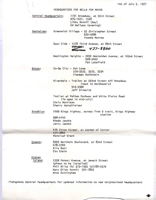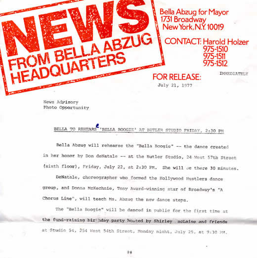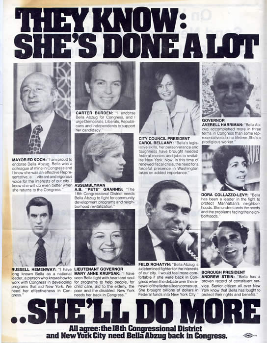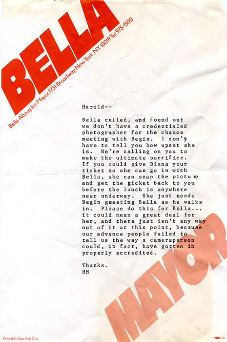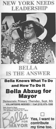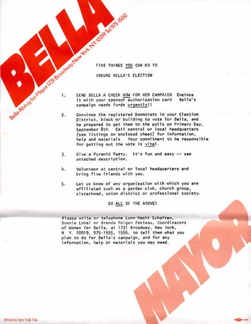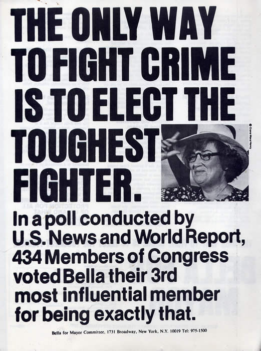 Enjoy these campaign materials from Bella's race for Mayor. Above, in the crush of campaigning along the sidewalk, Bella is accompanied by her daughter Liz now head of Liz Abzug Consulting Services and the Bella Abzug Leadership Institute and behind her, in boater, Harold Holzer, who became a renowned Shakespeare scholar and Metropolitan Museum Vice-President.