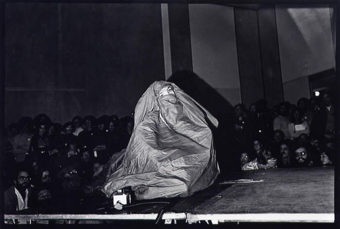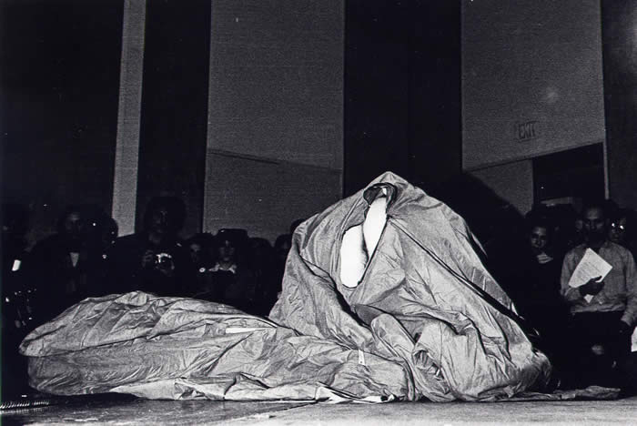 In recent correspondence, Joseph/Jody Burns, founder of the Museum of Holography and leading practitioner of Hologram Research, writes that "The cylindrical hologram in your photo of Charlotte performing the Kosugi bag piece at MoMA in 1977 is actually also Charlotte performing the same piece." He writes further about the perfomrance documented here: "I believe Takehisa Kosugi created that bag piece specifically for Charlotte. I was there also that evening at MoMA. Could that photographer lurking by the dais be Steve Borns? [Yes, that is he, photographing.]The cylindrical hologram in your top photo is a 360 degree hologram I made of Charlotte in 1975 performing that piece at my gallery space on west 20th St....https://whitney.org/Exhibitions/TakehisaKosugi and see also:
