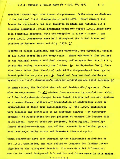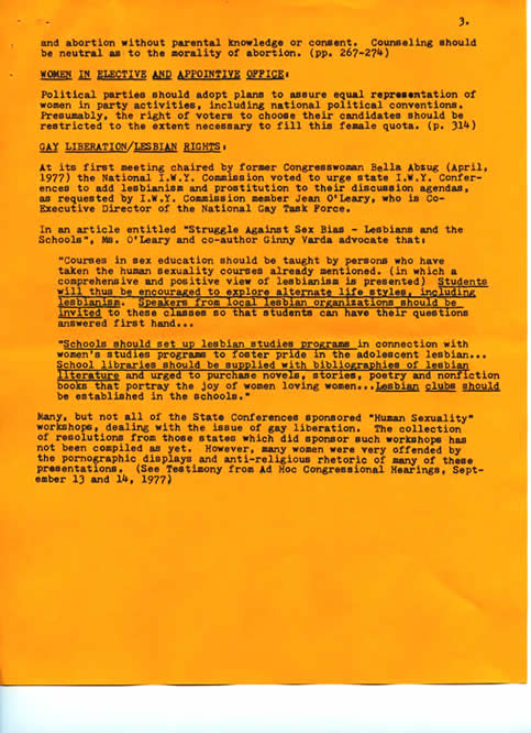 "At its first meeting chaired by former Congresswoman Bella Abzug (April, 1977) the National I.W.Y. Commission voted to urge state I.W.Y. Conferences to add lesbianism and prostitution to heir discussion agendas, as requested by I.W.Y. Commission member Jean O'Leary, who is Co-Executive Director of the National Gay Task Force." Jean O'Leary is at right, below.