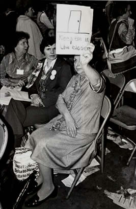 Joan Gubbins, speaker at 2:30-3:00 (above). Joan Gubbins led the opposition at the First National Women's Conference, where the anti-national plan forces wore "Majority" ribbons. Copyright © 1977 Diana Mara Henry. Email us for use, please.