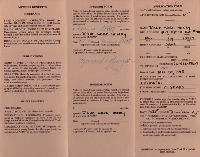 Diana Mara Henry first entered the doors of the first home of the International Center of Photography in 1974, before the opening of the museum at Fifth Avenue and 94th Street. She began by working as a volunteer in the bookstore, then was hired to work under the bewitching Via Wynroth in registration for the education program. Within a couple of years, Cornell Capa asked her to start a Community Workshop Program "so we can get grants." When she asked him what he wanted in that program, he said: "Just DO it!" She taught black and white photography and then Cibachrome printing for three sessions before quitting the unventilated basement darkroom. Before she left the ICP, in 1979, she asked Cornell to sponsor her for membership in the ASMP (American Society of Media Photographers.) He stunned her by refusing, saying, "You'd have to charge the day rate." When she said she already did, he further stunned her by asking, "Why would anyone hire you when they could hire ME?" He did recommend young men to the ASMP from among the ranks of his ICP entourage, even when they did not teach there. However, Diana Mara Henry received a warm recommendation from Berenice Abbott, so she was well consoled and honored.
