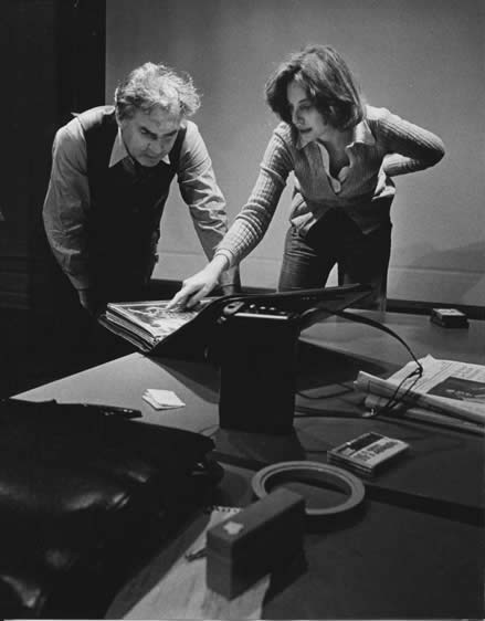 Showing her portfolio to Ernst Haas, circa 1976: Haas was so excited about the photo they are viewing, of the Harvard Student-Faculty meeting discussing divestment of South Africa, he ran down the hall to Cornell's office, shouting: "Cornell, Cornell, come see this photo!" HArvard's President Pusey at left, and front row, from right: Martin Peretz,Stanley Hoffmann, Erik Erikson.Lowell House Common Room, 1969.