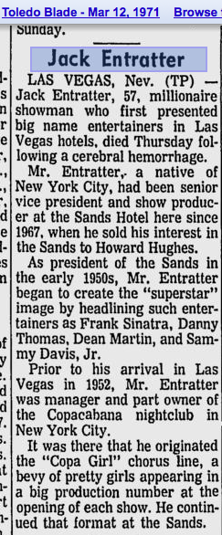 An equally famous brother, Jack Entratter, AKA Mr. Las Vegas,who put together the talen twhen he was at the Copa - Copacabana night club in NYC - and brought them to the Sands Hotel when he helped start it,