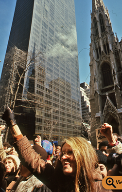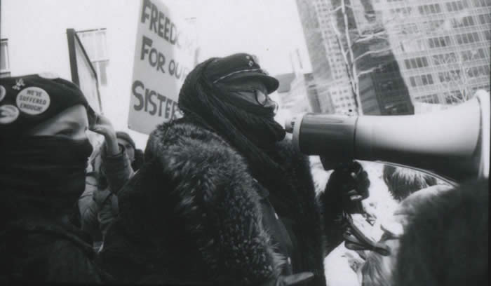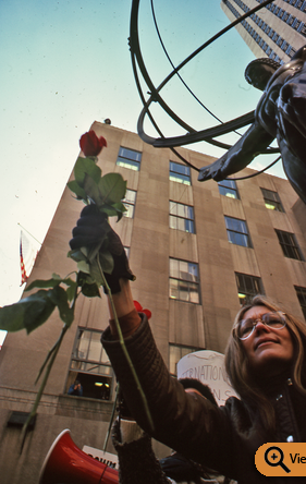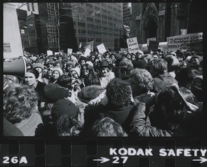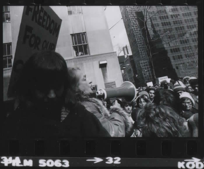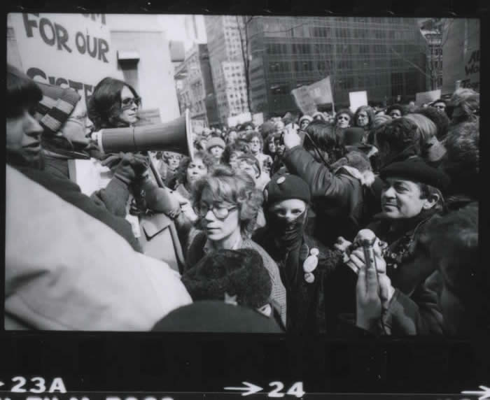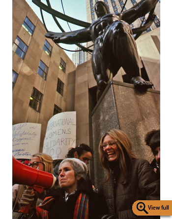 Gloria Steinem, above, with Grace Paley on bullhorn, and speaking in front of the Atlas statue at Rockefeller Center, NYC opposite St. Patrick's Cathedral."Great you were there!" wrote Gloria on 2/22/2015.Robin Morgan, the chief organizer of the demonstration, and Donna Hanley who also worked at Ms.are on either side of Gloria in the black and white ( scanned from a contact sheet, email us if you want a scan. Photographs Copyright © 1979 Diana Mara Henry. No reproduction without written permission. Email us now!