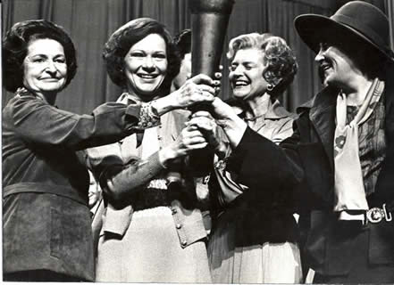Congresswoman Elizabeth Holtzman applauds in background, at left, as Ladybird Johnson, Rosalyn Carter, Betty Ford, first ladies, Linda Robb behind them, and Bella Abzug hold high the torch at the opening of the First National Women's Conference, Houston, 1977. Donna de Varona stands beside them, Suzy Chaffee and Michelle Cearcy below, and in foreground, Peg Kokernot and Sylvia Ortiz.