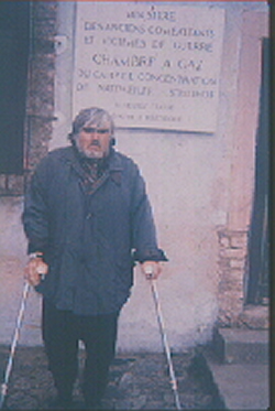 Besides the murders of Jews in the gas chambers at Natzweiler, there occurred lethal experiments involving the gassing of Gypsies in experiments by Drs. Haagen and Bickenbach to explore the efficacy of "antidotes" to exposure to mustard gas. This man, photographed outside the gas chamber during a return visit to Natzweiler after the war, said he was a survivor of one of those experiments. His experience is described in a statement published in Le Camp de Concentration du Struthof: Konzentrationslager Natzweiler: Témoignages, edited by Jean Simon, published by Essor, Schirmeck, 1998. |