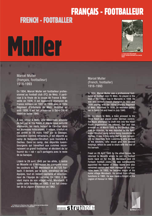 See their posters below for the profiles of two pro soccer players impreisoned at Natzweiler, including Marcel Muller...and news of the visit of German and French soccer teams to the KLNa...