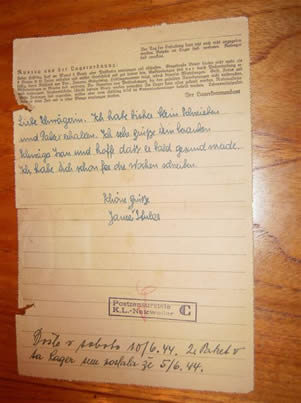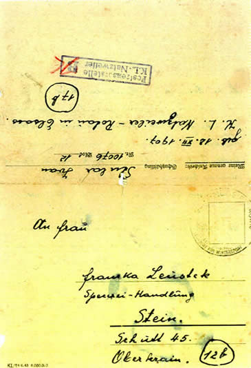 "The last two lines [above] written by my aunt Franziska Levstek: 'Arrived on Saturday, June 10, 1944. I had already sent 2 parcels to KL on June 5, 1944.'"My aunt's last name is Levstek; however, I notice that my father spelled it Leustek. Her first name is Frances or Francka in Slovenian or Franziska in letters."