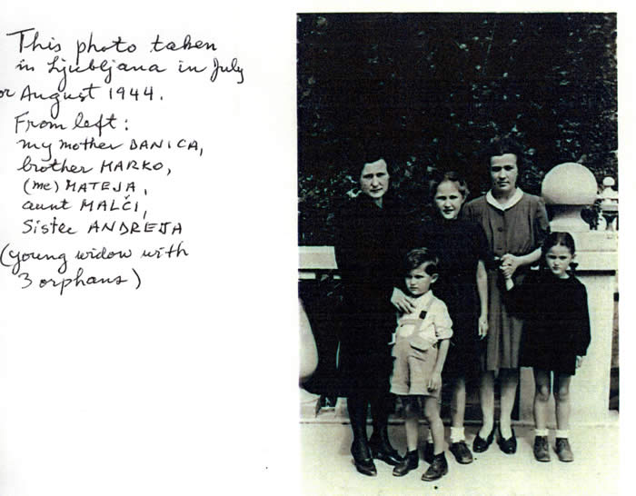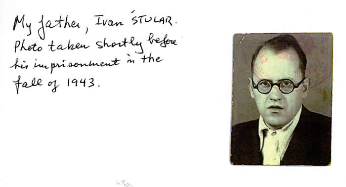 "My father, Ivan Stular was first imprisoned (with about 19 others) in Vrhnika in early December 1943 and after a few days sent to a bigger prison in Ljubljana (present-day capital of Slovenija). I can still hear the heavy knock on our front door very early in the morning - it must have been about 6:00 am because my grandmother Marija had already gone to church to attend the daily Mass. When we opened the door, two German soldiers armed with rifles asked for my father who was told to get ready at once. They showed him a piece of paper saying that they are just carrying out their orders.