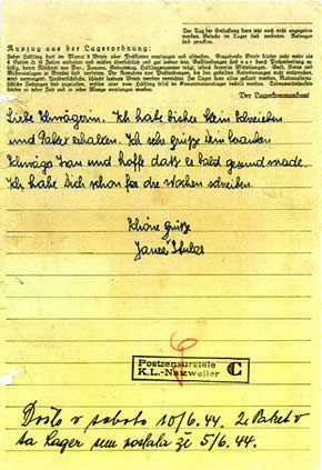 I do not speak German so I turned in August 2000 to Jewish Community Centre here in Vancouver, B.C. for translation. A very kind man, John Gort, provided me with translation of my father's letters from Dachau and KL Natzweiler. But first, excerpts from Camp Orders at KL Natzweiler [printed message at top]: