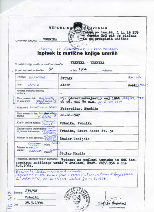"My father, Ivan Stular, prisoner #: 60974 died in Natzweiler in 1944..... Ivan and/or Janez means John in Slovenian.