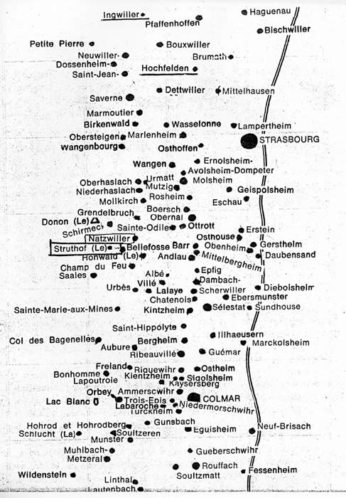 From a wine taster's map of Alsace. (Villages underlined are where the family of Diana Mara Henry used to live, before they were for the most part extinguished by French Fascists in Vichy France during the war -see the story elsewhere on this site.) Natzwiller and Le Struthof, the place names of the locales where the Natzweiler-Struthof concentration camp was located, are boxed. The wavy line running the length of the map represents the Rhine river, beyond which lies Germany.