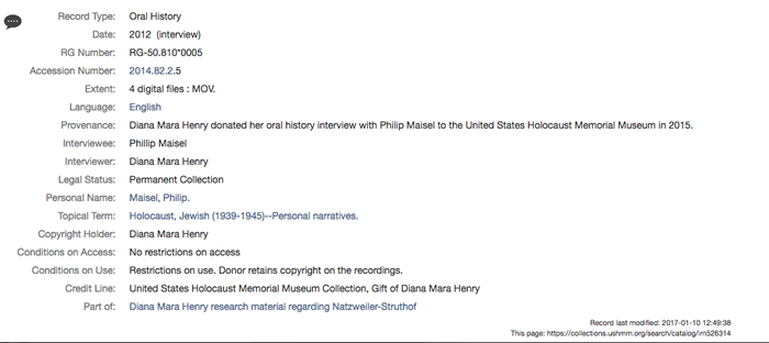 Diana Mara Henry's interview of Phillip Maisel is in the collection of the US Holocaust Memorial Museum at