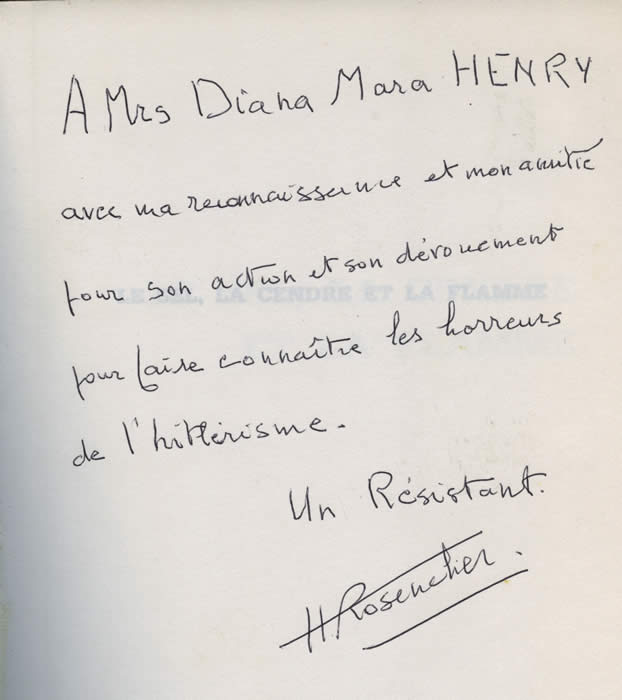 "To Mrs. Diana Mara Henry with gratitude and my friendship for her action and dovotion to make known the horrors of Hitlerism. A resistor, H. Rosencher."