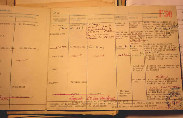 Madame Louis, was the "liquidatrice" or person in charge of wrapping up and vetting the members of Georges France / Groupe 31, whose seal can be seen at lower right, around the cross of Lorraine, the icon of de Gaulleover her signature with date October 24, 1946. Thanks to Tim Austin for this awesome find! In the column at far right is handwritten in the block of info just over the bottom line: "Deported Passed to Castille network" and typed right below that "Interpreter SNCF a[d]j[utant] Turban - information- recruiting - and liaison - arrested 4/2/42 deported-liberated MAY 194[5]". The three columns at leftjust over the bottom line, relating to André ( left page below) are crossed out: Far left column: date of entry into the network: April 1941; second column from left: Date of arrest: 4/2/42 (February 4, 1942); third column from left: date of repatriation: MAY 1945. Written by hand in red under the strikeout "Liquidé P2 by OVERCLOUD" meaning that he was vetted and registered by the liquidator of Overcloud, Joel  Le Tac, as see on the documents at http://www.dianamarahenry.com/AndreJosephScheinmannCartedeCombattantVolontaire.htm
