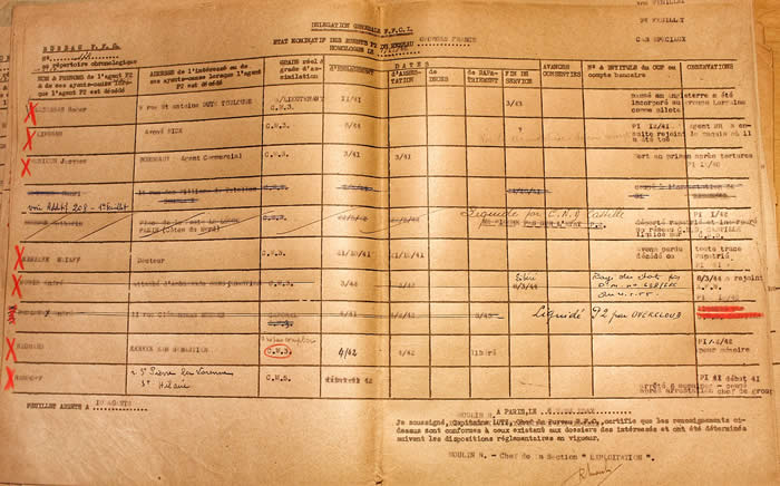 Signed R. Moulin, Paris, March 6, 1947. Also attested to per the typecript by Captain Lutz, head of the Bureau of the F. F. C. ( Forces Françaises Combattantea) Also at top are the indications that it is a chronological listing of elements of the network Georges France as vetted on 7/11/46 (November 11, 1946)...