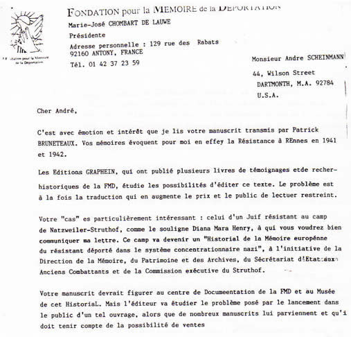 Your "case" is particularly interesting: that of a Jew in the Resistance at the camp of Natzweiler-Struthof, as underscored by Diana Mara Henry, to whom I hope you will communicate this letter. This camp is going to become a " Historical Monument of the European Memory of the Deported Resistance Members in the Nazi Concentration camp system," at the initiative of the Administration of Memory, Patrimony and Archives, under the Secretary of State for veterans and the Executive Commission of the Struthof. [French name of the KLNa.] Your memoir should take its place at the research center of the FMD and at the historical museum.....