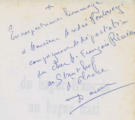 "In respectful homage for André Peulevey, companion in the camps of dear Mr. Françcois Rivière at the Struthof in Alsace. David" " Abbé David, author of Du Bagne Français au Bagne Nazi 1941-1945 ("From the French forced labor camp to the Nazi forced labor camp") his inscription in the book to André.