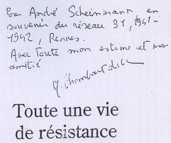 Marie-Jo Chombart de Lauwe:" For André Scheinmann, remembering network 31, 1941-1942, Rennes. With all my esteem and friendship." See her correspondence with André and her details of how she worked with him