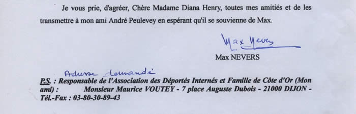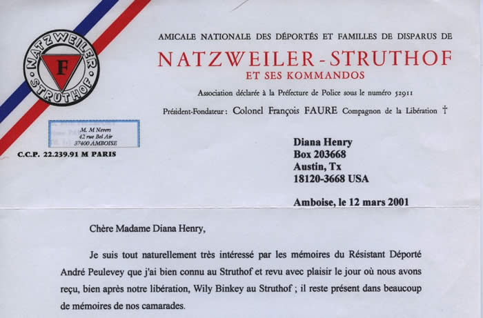 1943-1945: La Resistance en Enfer, Roger Leroy, Roger Linet, Max Nevers (Paris, Messidor, 1991), pages 88, 154, 159, 204 are about André's courageous and generous actions in camp on behalf of his comrades. Here Max Nevers writes to Diana Mara Henry, on letterhead of the National Association of prisoners and families of the disappeared of Natzweiler-Struthof and its kommandos (slave labor dependencies):"I am, naturally, very interested in the memoirs of the Resistor and Prisoner André Peulevey, whom I knew at the Struthof and saw again with pleasure on the day, long after our liberation, we greeted Willy Binkey at the Struthof; he remains present in the memory of many of our comrades. ....I send you all my firendship and hope you will send the same to my friend André Peulevey, hoping that he remembers Max."