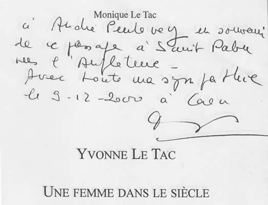 Signed by Monique Le Tac: "To André Peulevey, remembering the stopover at Saint Pabu on the way to England. With all my good feelings, December 9, 2000 at Caen." •Yvonne Le Tac: Une Femme dans le Siècle (de Montmartre à Ravensbrück), Monique Le Tac (Paris: Editions Tirésias, 2000), pages 124-126
