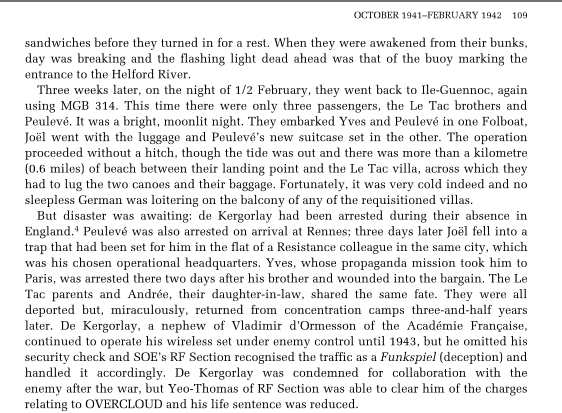 •Sir Brooks Richards: Secret Flottillas, Vol 1: Clandestine Sea Operations to Brittany 1940-1944. "The passengers had arrived on after another at the Le Tac villa...Peulevé [sic] an intelligence agent of Austrian Jewish origin who had been working as a radio operator in Rennes in a BCRA intelligence network known as 'Georges France 31'..." ( page 115) "Three weeks later, on the night of 1/2 February, they went back....This time there were only three passengers, the Le Tac brothers and Peulevé [sic. This is the spelling of another British agent's name, a Brit  AKA  the White Rabbit, who was interned at Buchenwald.] It was a bright, moonlit night. They embarked Yves and Peulevé in one Folboat, Joêl went with the luggage and Peulevé's new suitcase in the other.....But disaster was awaiting:de Kergolay had been arrested during their absence in England. Peulevé was also arrested on arrival in Rennes...." ( page 116) This is listed as OVERCLOUD operation for SOE ( Special Operations Executive-the Le Tacs served in its RF section) whereas on page 314 "Peulevé AKA  'Le Neveu'" ( André's alias) is listed as part of TURQUOISE - an SIS ( Secret Intelligence Service) operation. In his mémoir André states how, upon landing, he declined Colonel Passy's invitation to join the French and insisted on continuing to work for the British SIS.