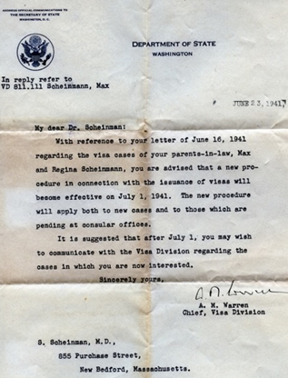 Why André's parents couldn't come to the US- put off by the State Dept. on 6/23/1941 that doomed them to their death in the concentration camps. Response to their daughter Mady's husband, Dr. Scheinmann, a US citizen: