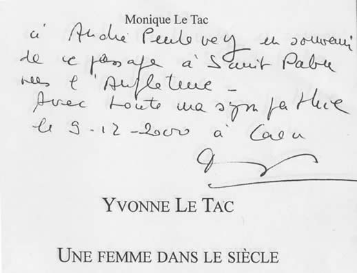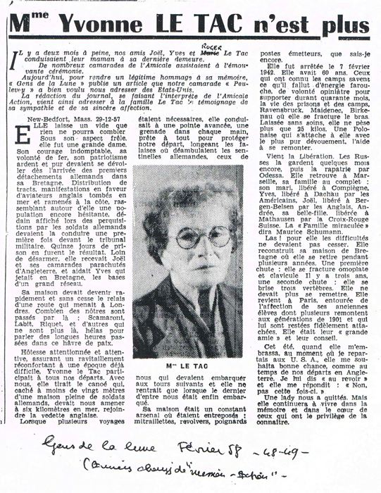 Mrs. Yvonne LE TAC is no more ,André's obituary tribute and memories of Yvonne Le Tac from whose house and with whose sons he left for England and back January6-February 1, 1942, that was published in Gens de la Lune (People of the Moon) February 1958. Translated by Diana Mara Henry from the article shown at right.